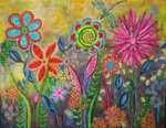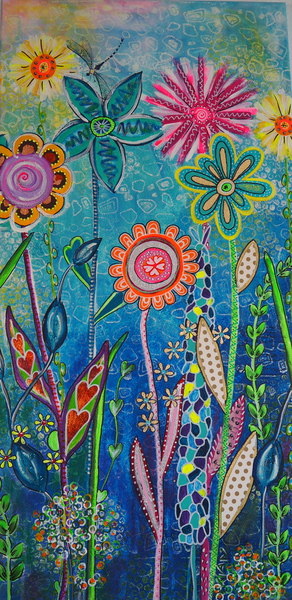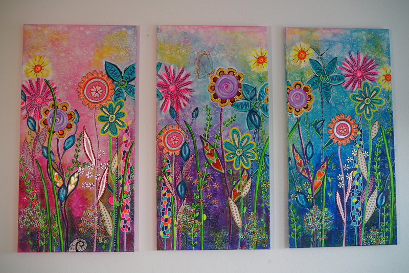 Papierstreifen, Druckvorlagen, Tapetenrollen, Acryl, Edding und Wachsmalkreiden, sowie Glitter machen diese Bilder einzigartig.